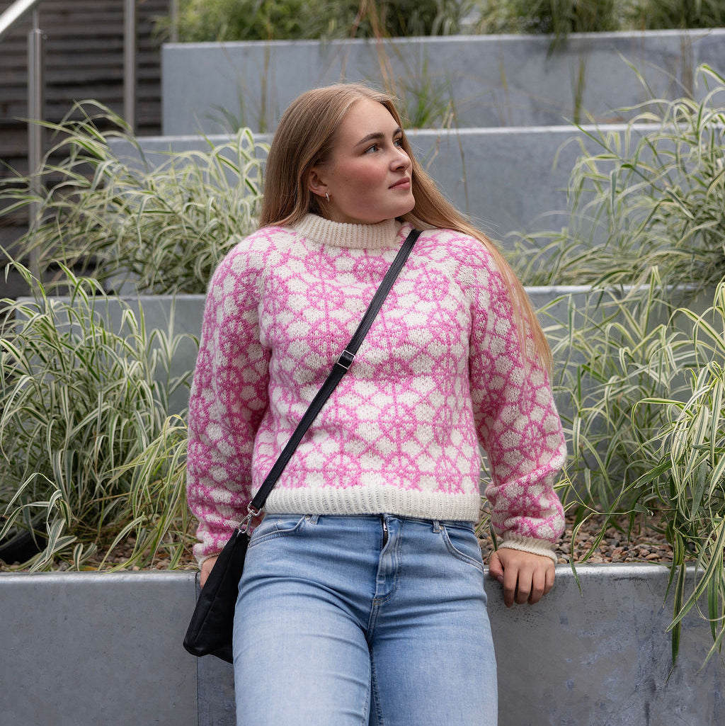 Kirjoneulekuvio on helposti omaksuttava, toistuva ja langanjuoksutkin vain muutaman silmukan pituisia. Tarvikepaketin ohje on kokoihin XS/S, M/L ja XL/XXL.