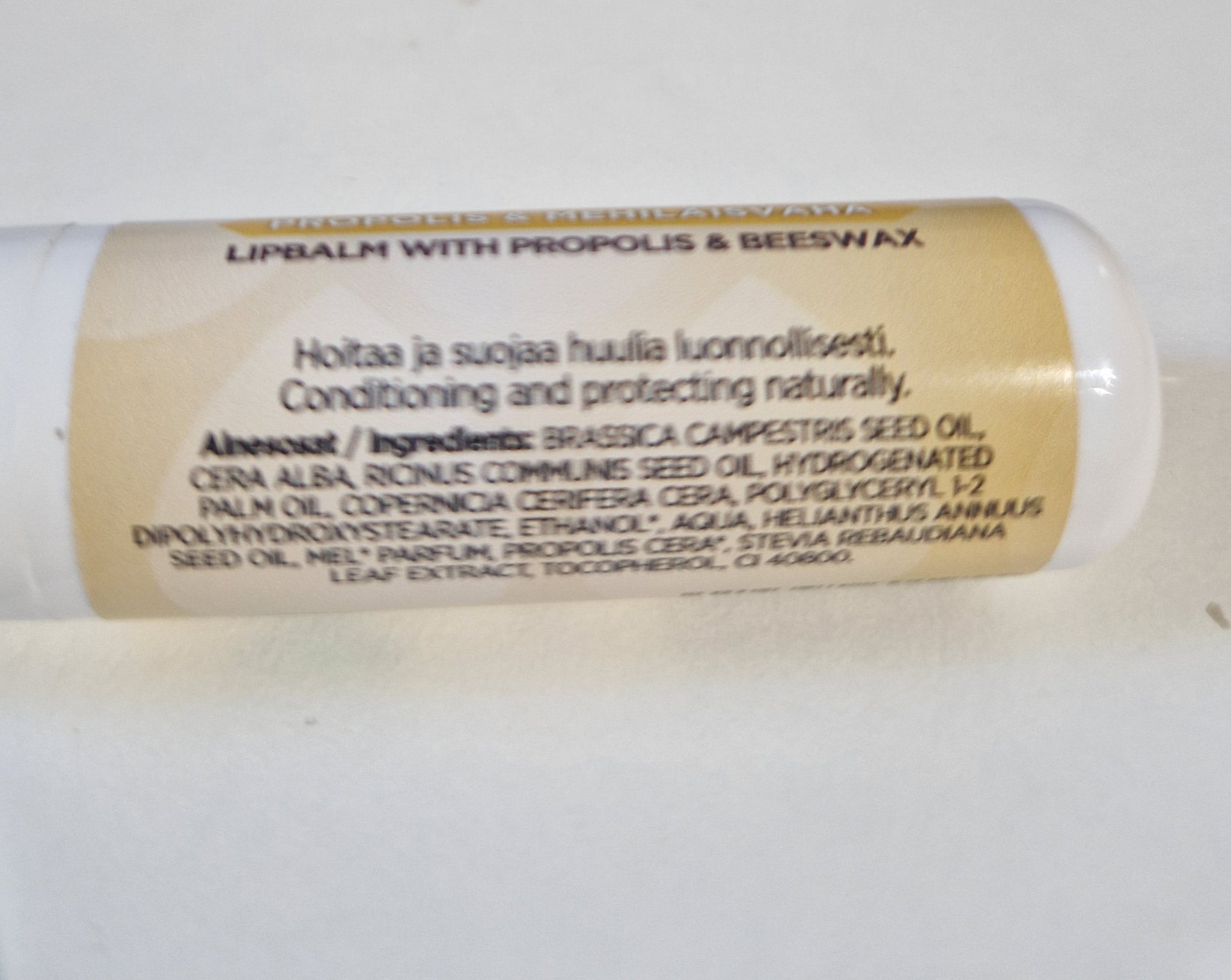 Näppärä huulivoidepuikko, jonka vaikuttavina ainesosina on mehiläisvaha ja propolisuute.