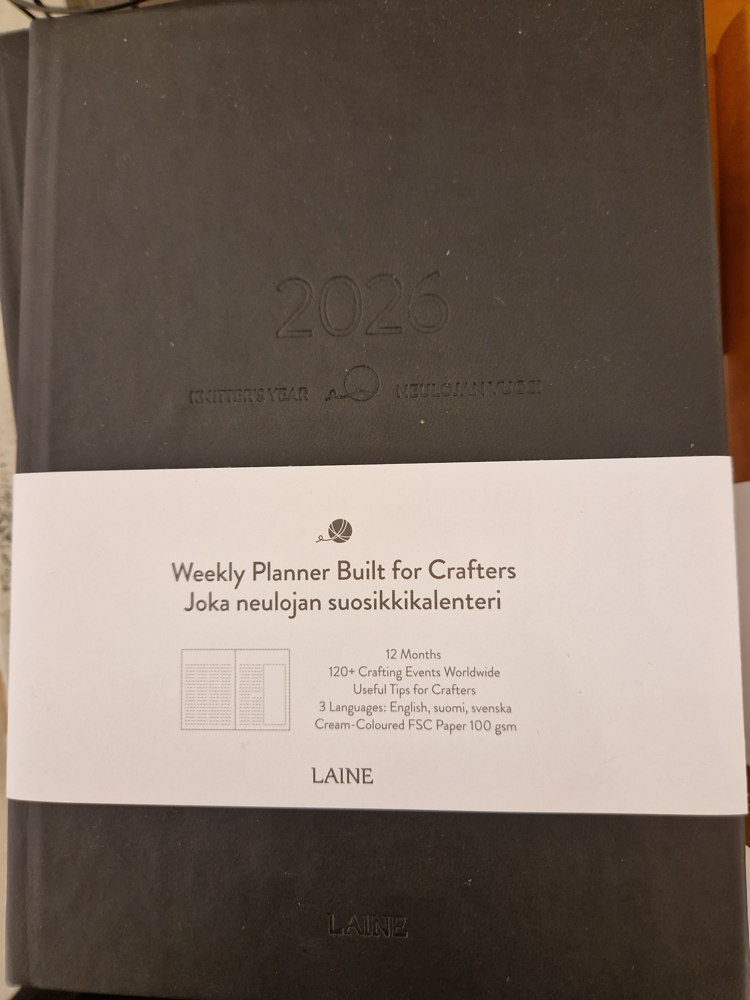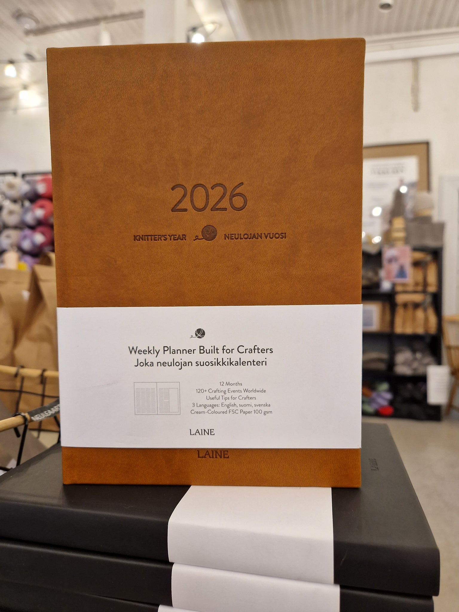 Kalenteri vuodelle 2026. Perus kalenterisivujen lisäksi paljon neulojalle suunnattua sisältöä ja tilaa neulemuistiinpanoille.